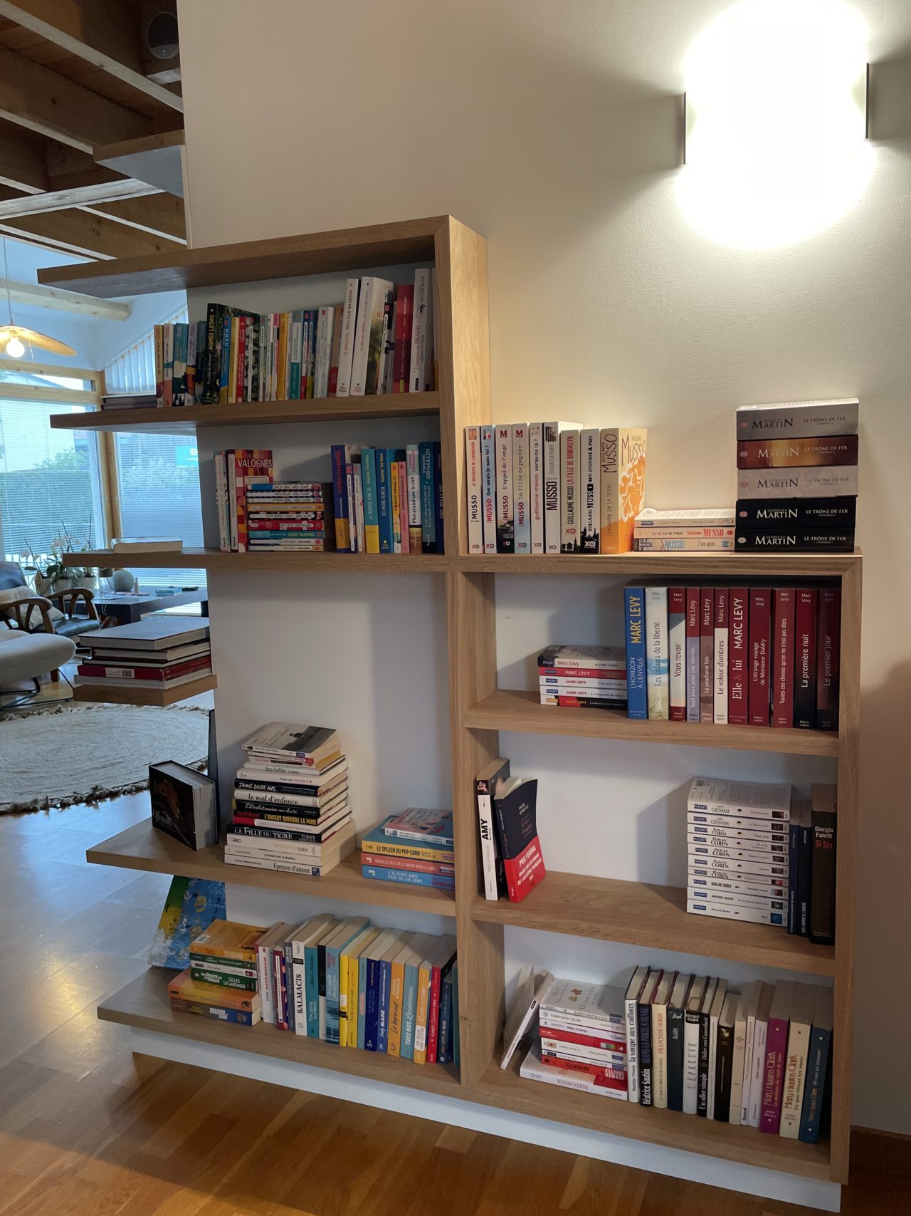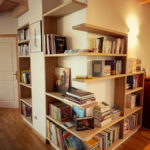 Dans ce projet d’agencement intérieur, l’objectif était de transformer un simple lieu de passage en un espace à part entière, à la fois utile, esthétique et porteur de caractère. L’angle saillant de la pièce, jusqu’alors peu valorisé, est devenu le point de départ de la réflexion architecturale. Plutôt que de le dissimuler, le choix a été fait de le mettre en scène grâce à une bibliothèque dessinée sur mesure, pensée comme un véritable élément d’architecture intérieure.