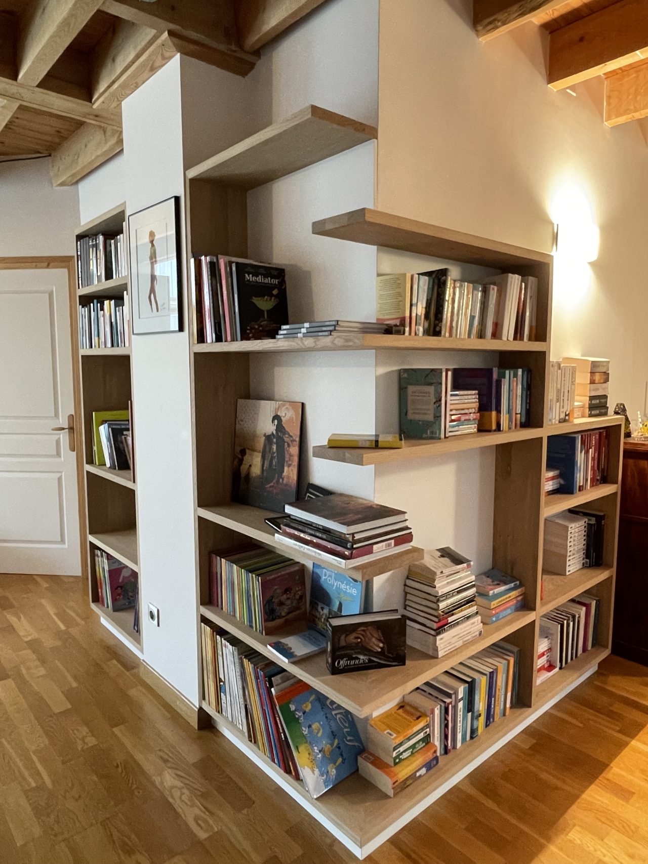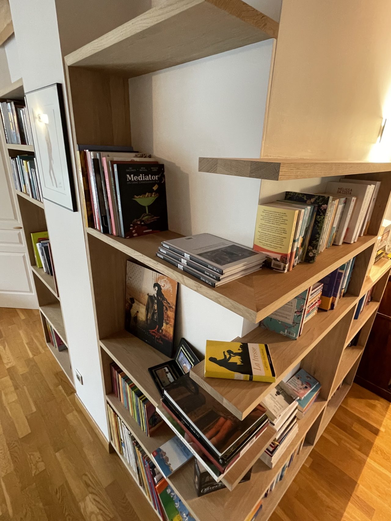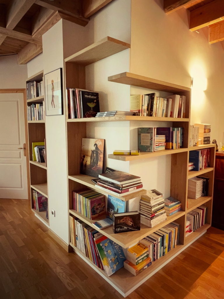 Le dessin de cette bibliothèque repose sur des lignes fines, offrant une lecture légère du volume. Le mobilier épouse précisément la géométrie existante de la pièce, soulignant l’angle saillant et lui donnant une nouvelle fonction. Par son implantation, la bibliothèque structure l’espace et anime le parcours : ce qui n’était auparavant qu’un passage devient aujourd’hui un lieu vivant, fonctionnel, invitant à la pause.