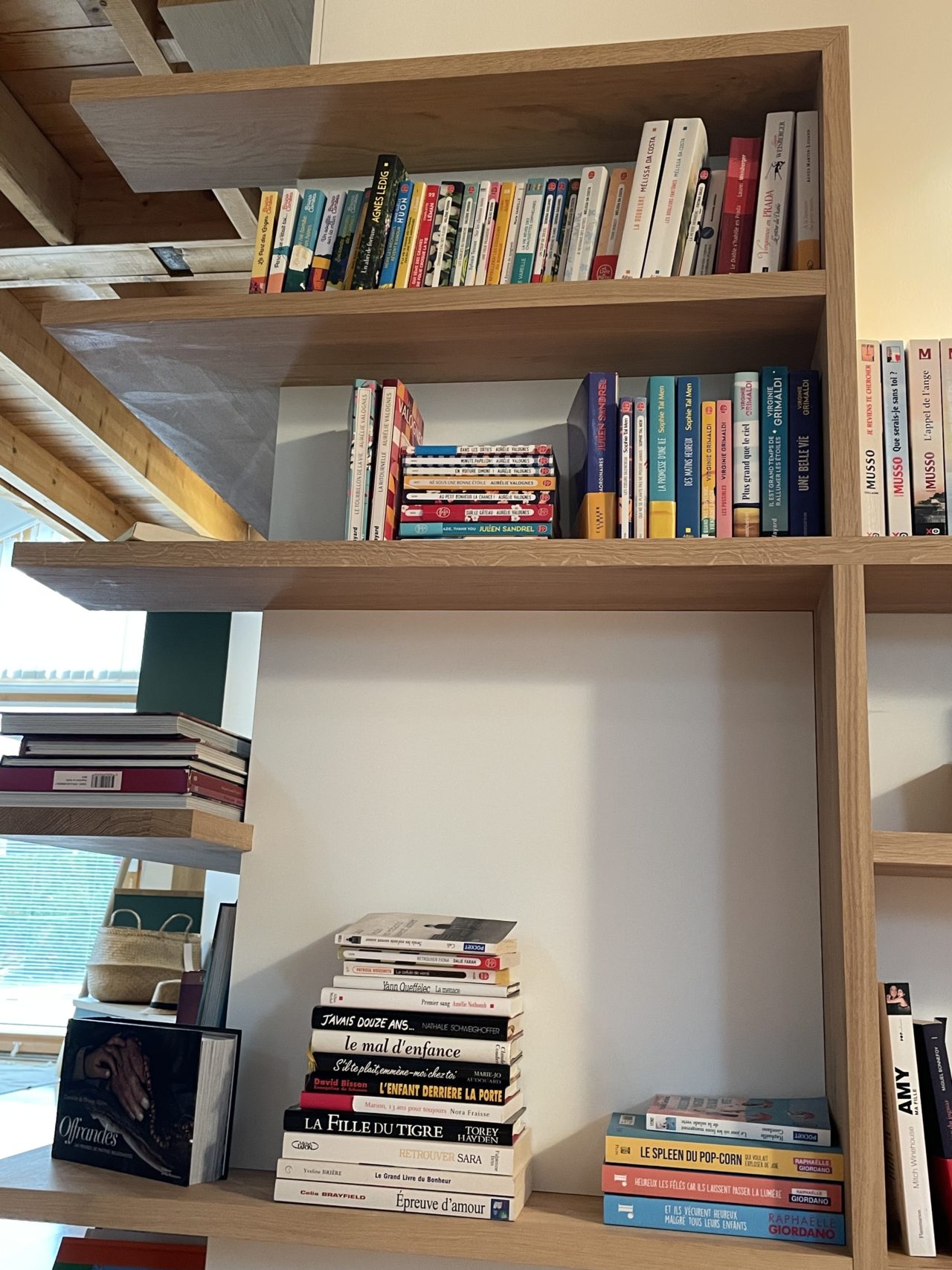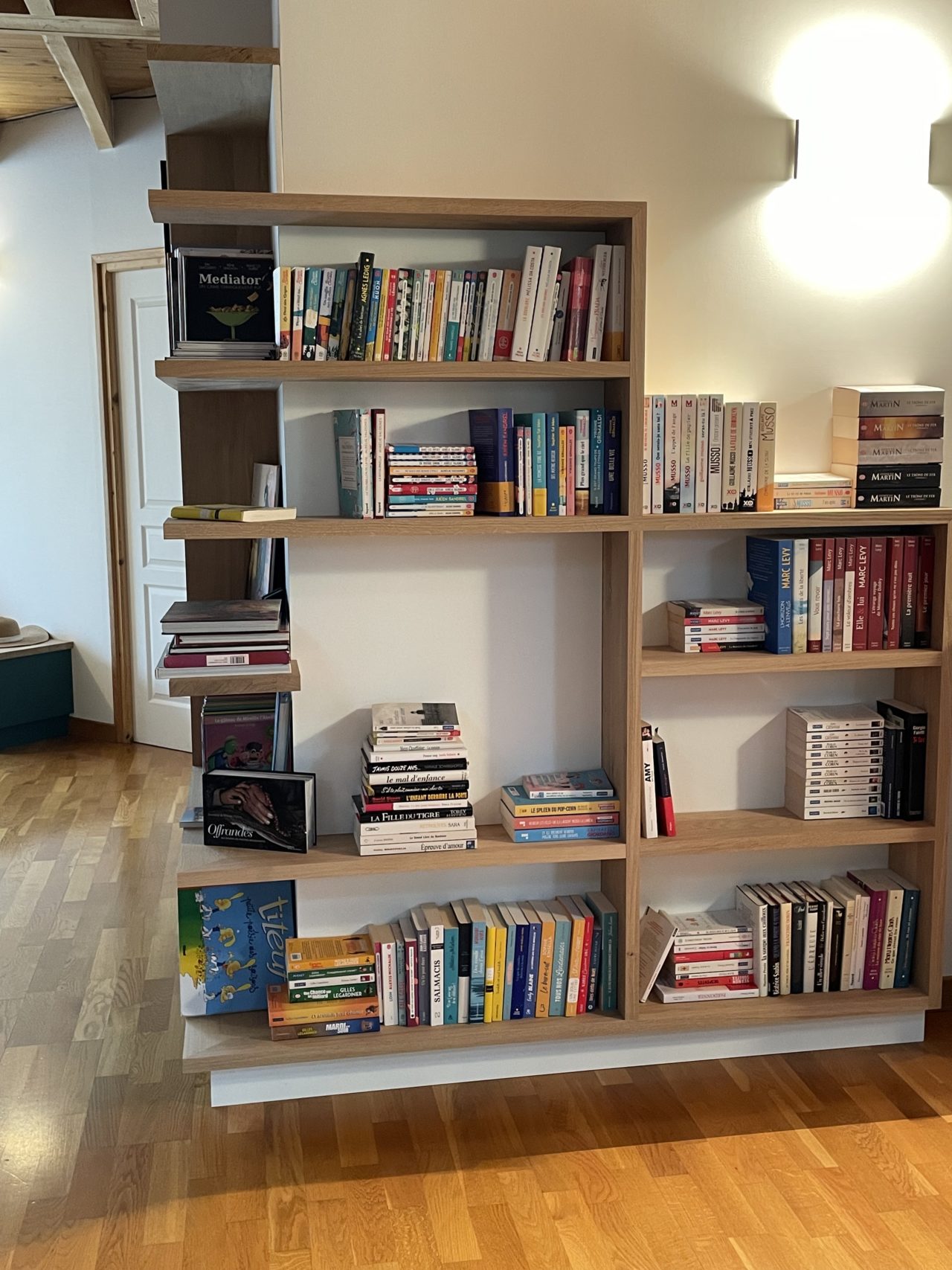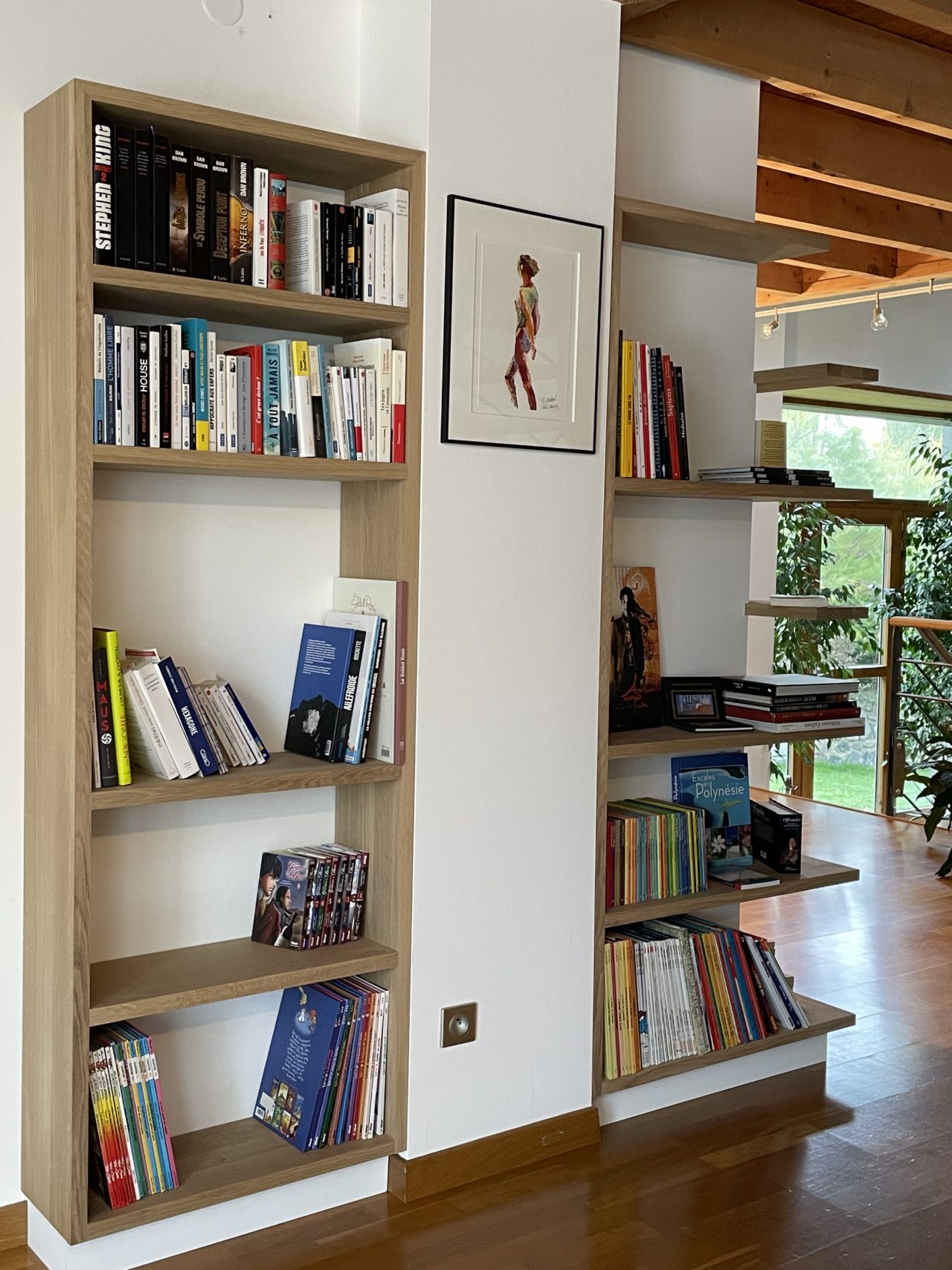 Le dessin de cette bibliothèque repose sur des lignes fines, offrant une lecture légère du volume. Le mobilier épouse précisément la géométrie existante de la pièce, soulignant l’angle saillant et lui donnant une nouvelle fonction. Par son implantation, la bibliothèque structure l’espace et anime le parcours : ce qui n’était auparavant qu’un passage devient aujourd’hui un lieu vivant, fonctionnel, invitant à la pause.