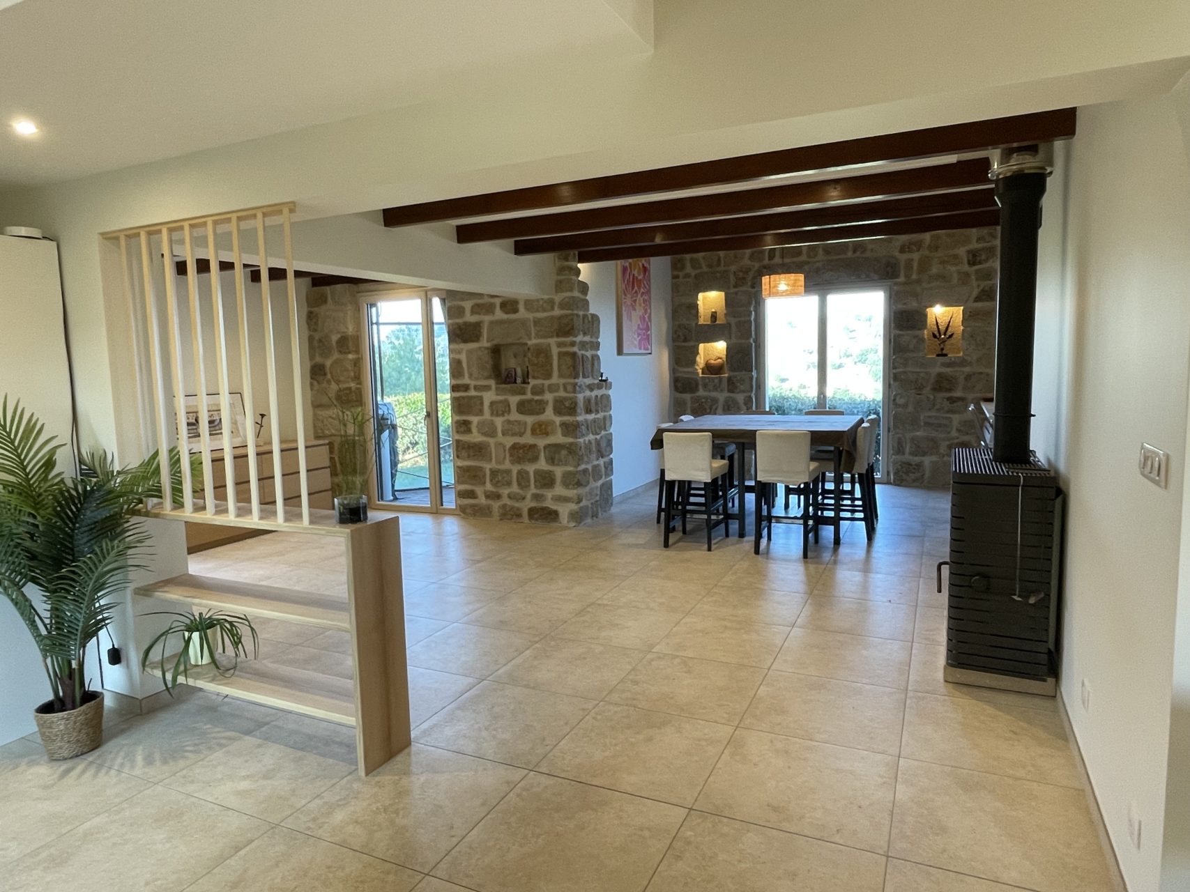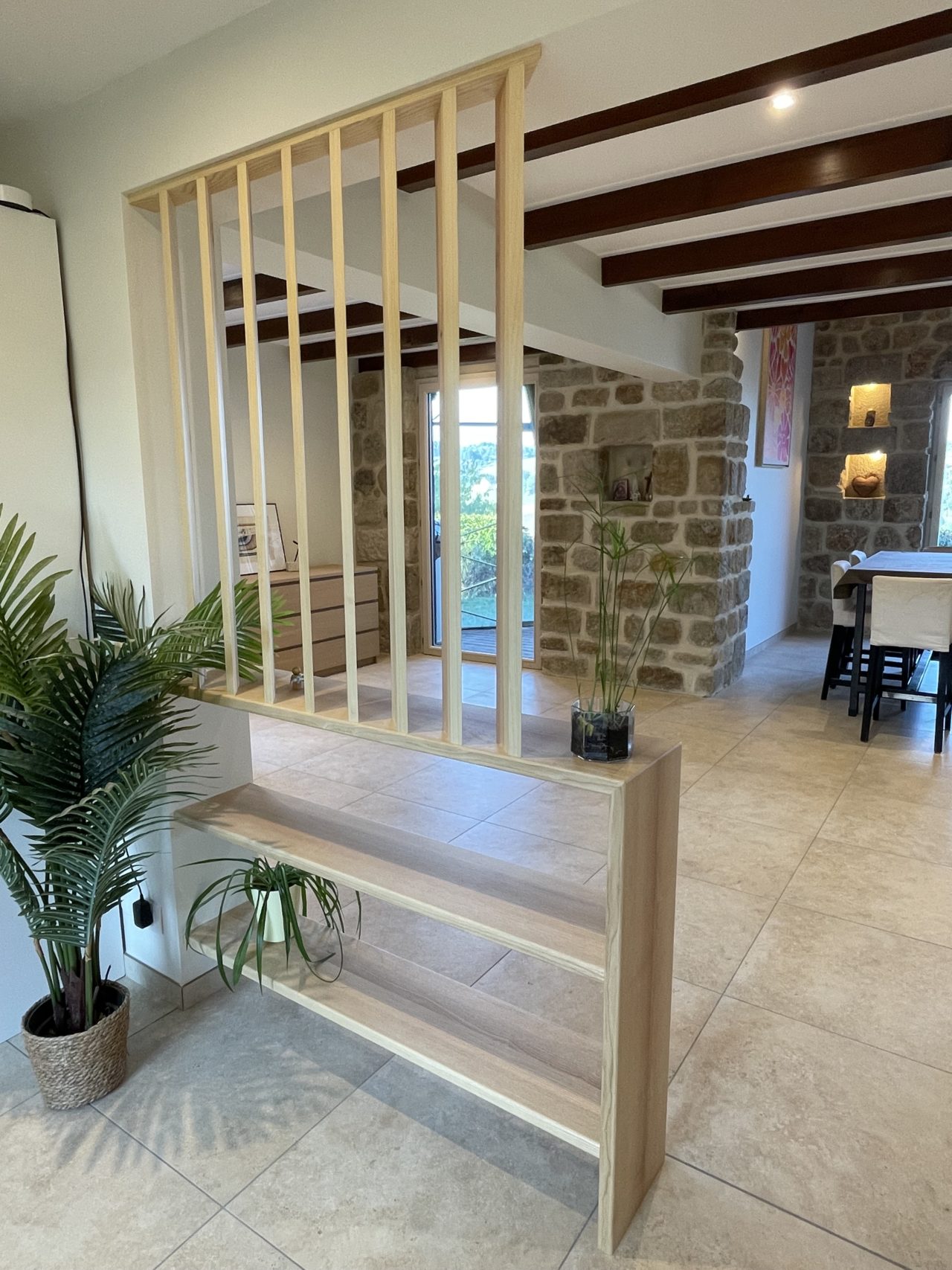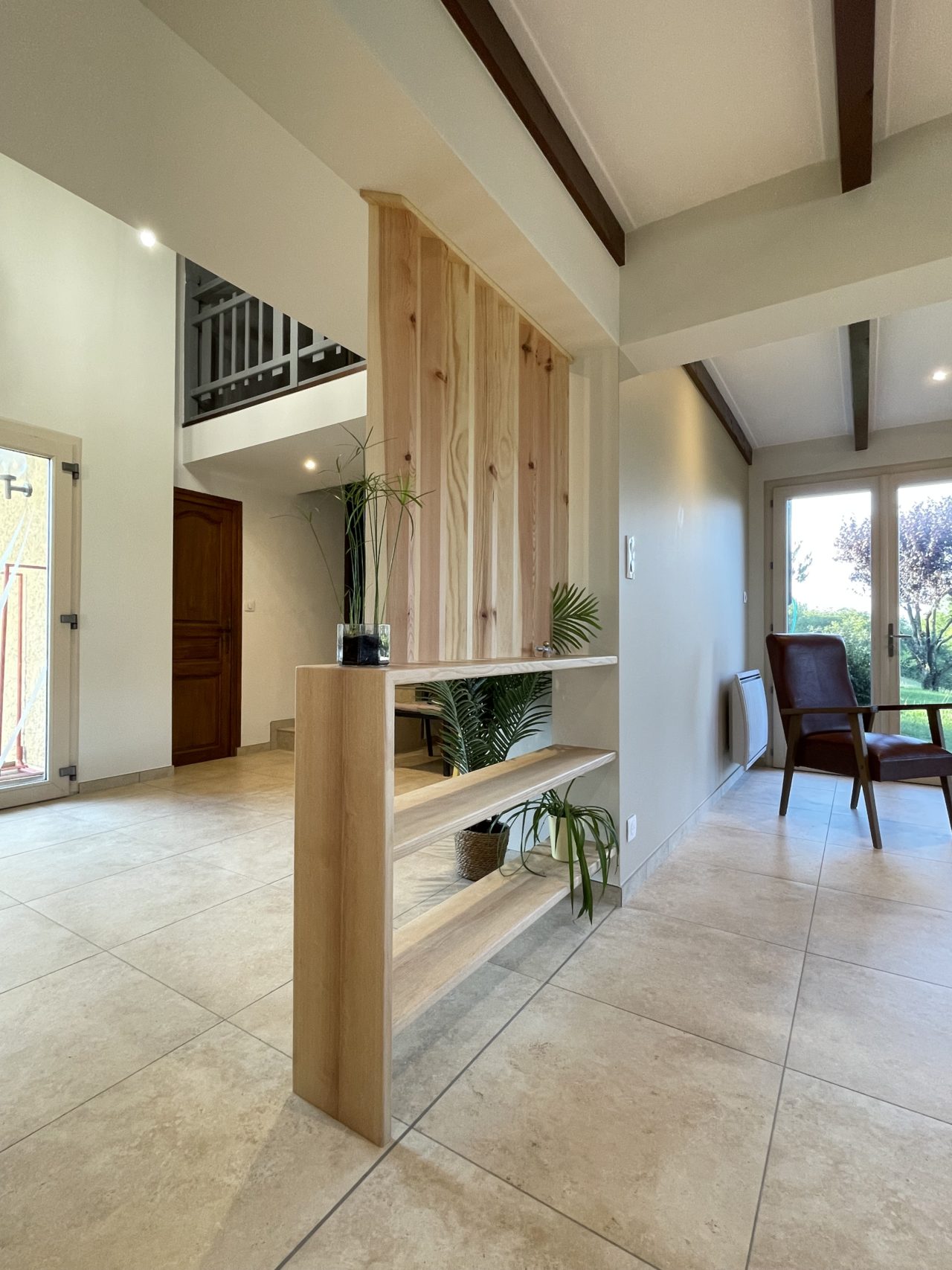L’intervention sur les volumes permet aujourd’hui aux pièces de gagner en luminosité et en sensation d’espace, offrant une lecture plus ouverte et contemporaine de la maison. Les matériaux sélectionnés participent pleinement à l’identité du projet : des matériaux nobles, et notamment le bois massif utilisé pour les claustras, viennent structurer les espaces tout en conservant une atmosphère chaleureuse et élégante.