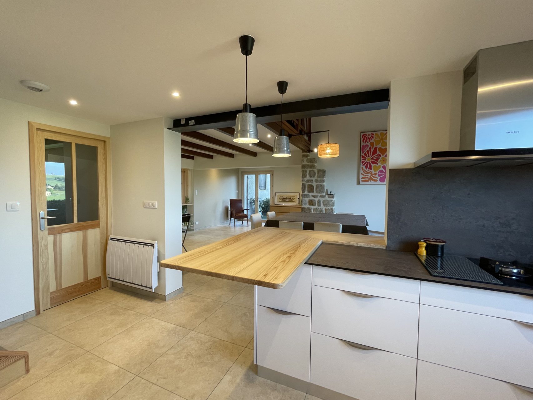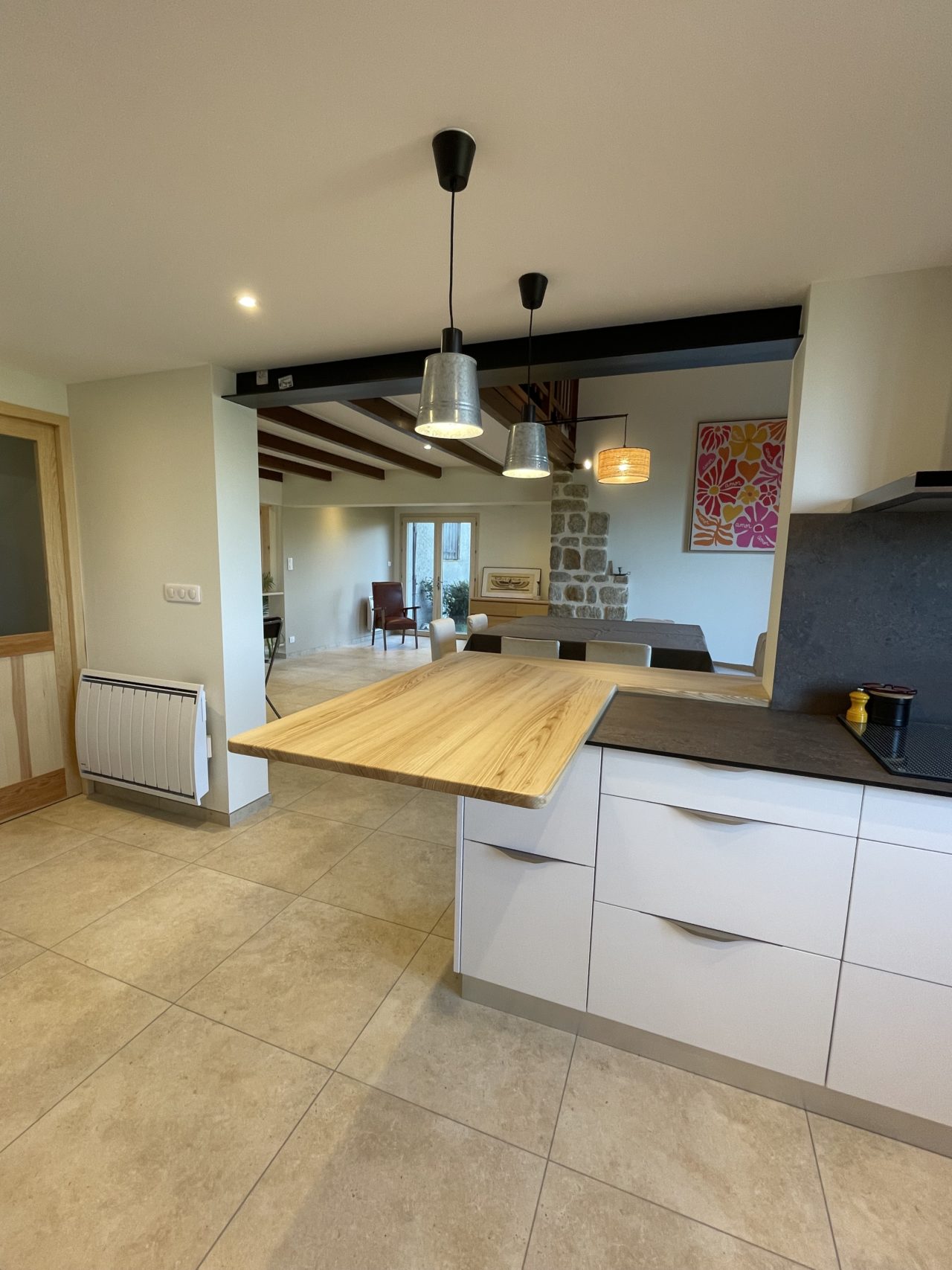 Ce projet de transformation des pièces de vie avait pour objectif de repenser les volumes existants afin d’offrir plus de fluidité, de lumière et de confort au quotidien. La cuisine a été ouverte sur le séjour, créant un espace de vie convivial et cohérent, tandis que l’entrée a été dégagée pour laisser pleinement circuler la clarté naturelle.