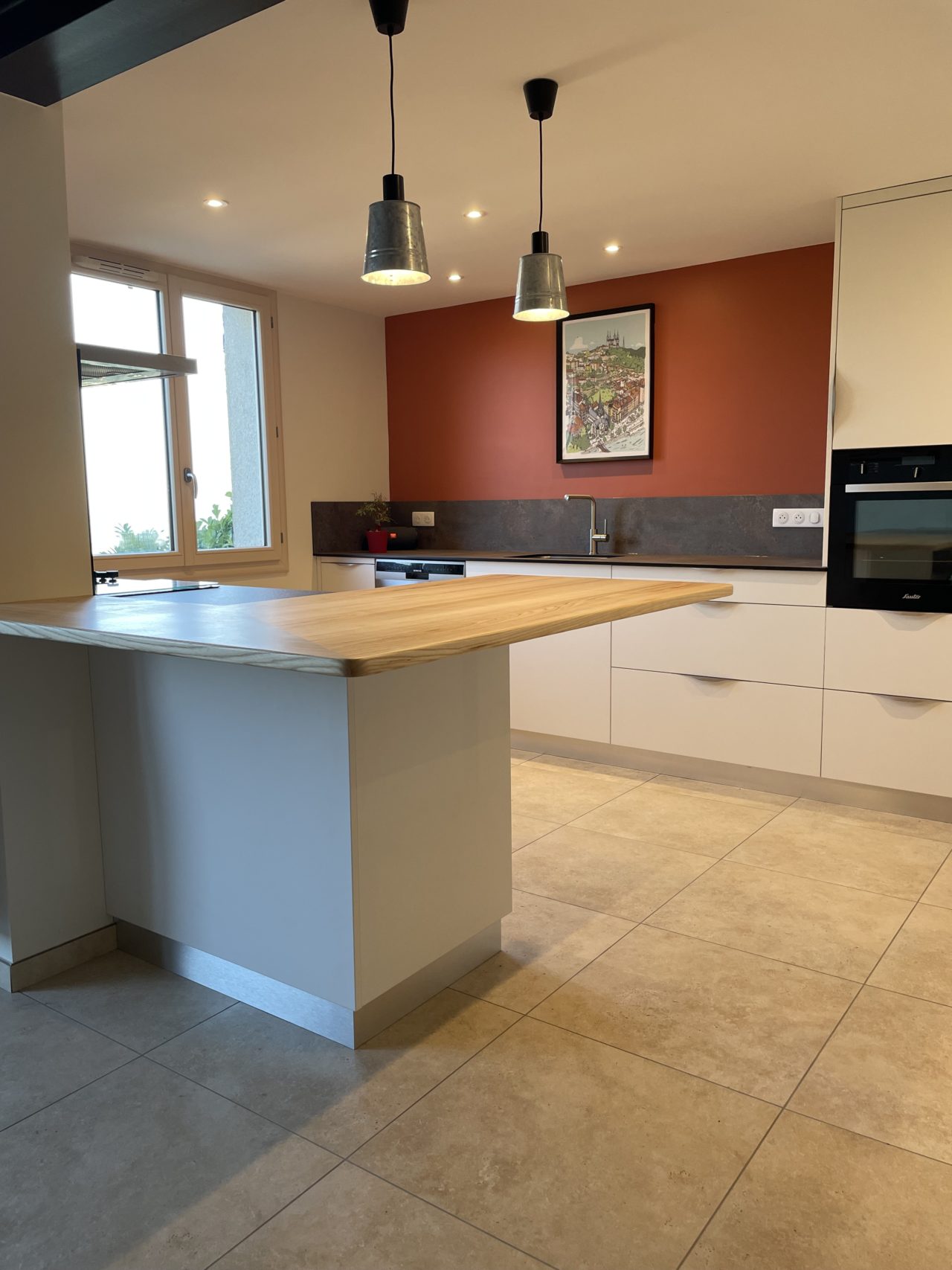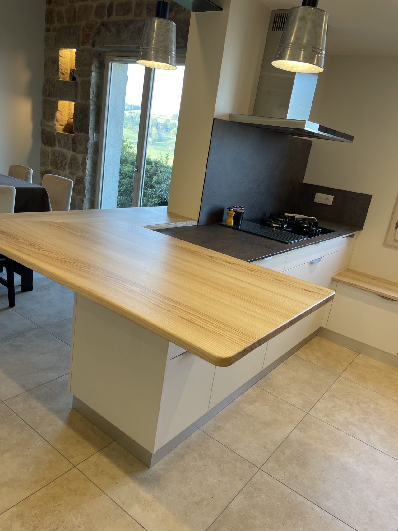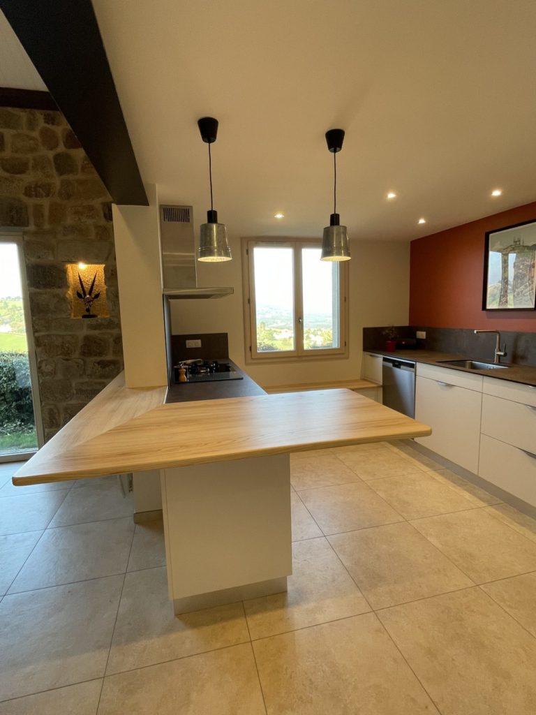 La cuisine se distingue par un élément fort, pensé comme une véritable signature du projet : une table en porte-à-faux, dessinée et conçue sur mesure. Dépourvue de pieds, elle libère les circulations, facilite l’usage des assises et renforce la légèreté visuelle de l’ensemble.
