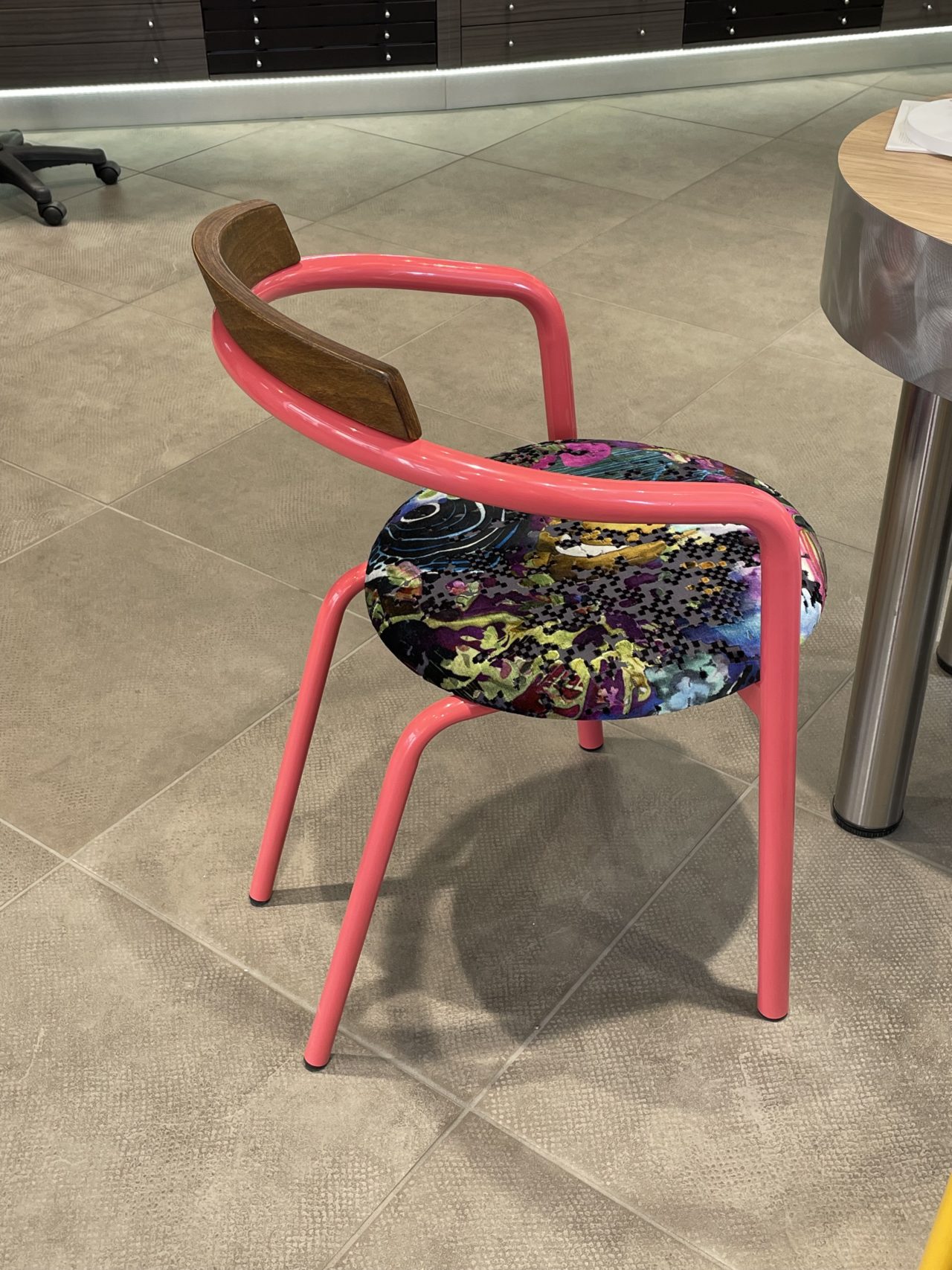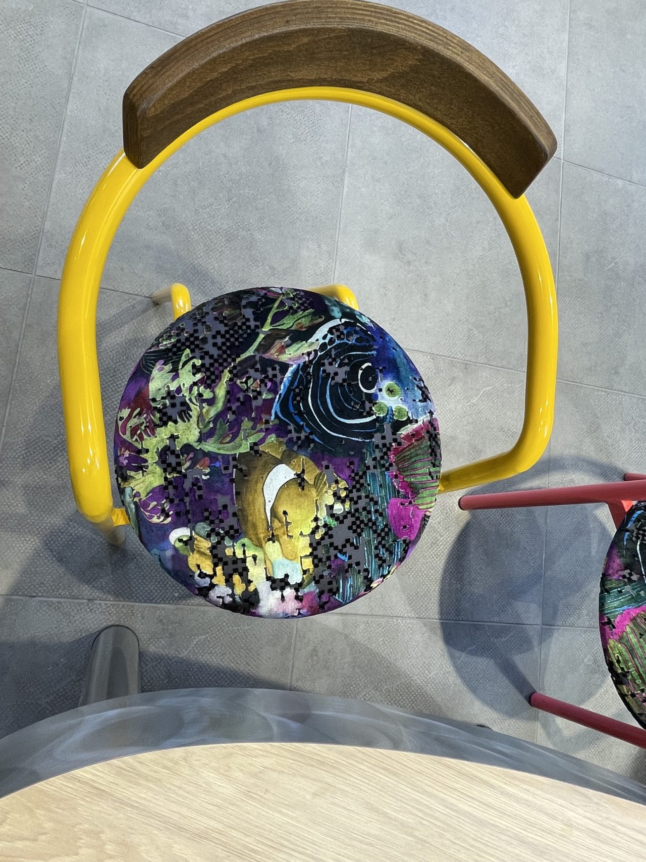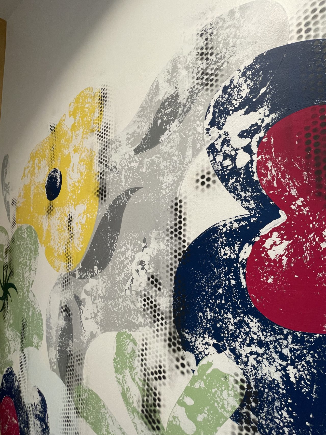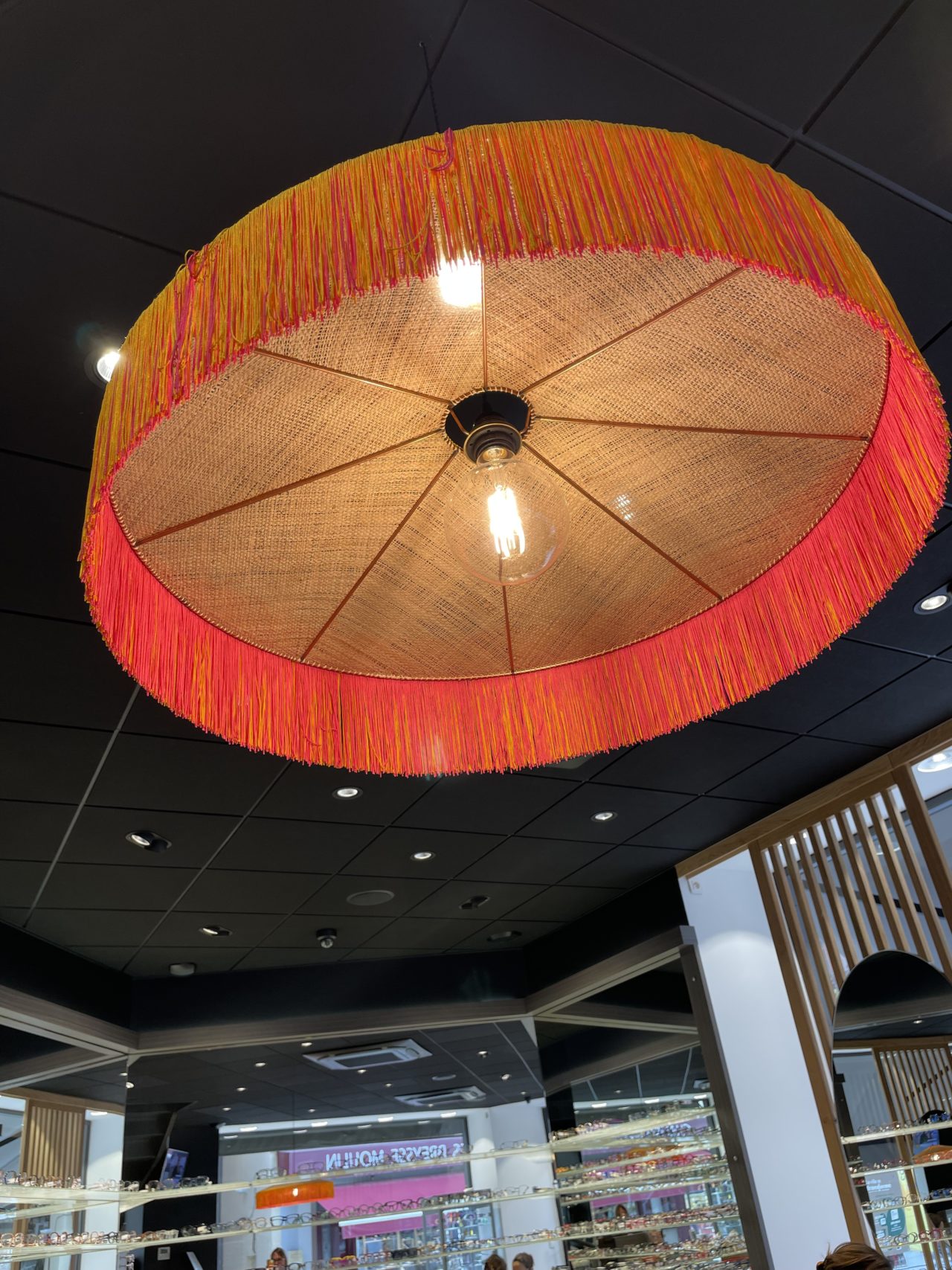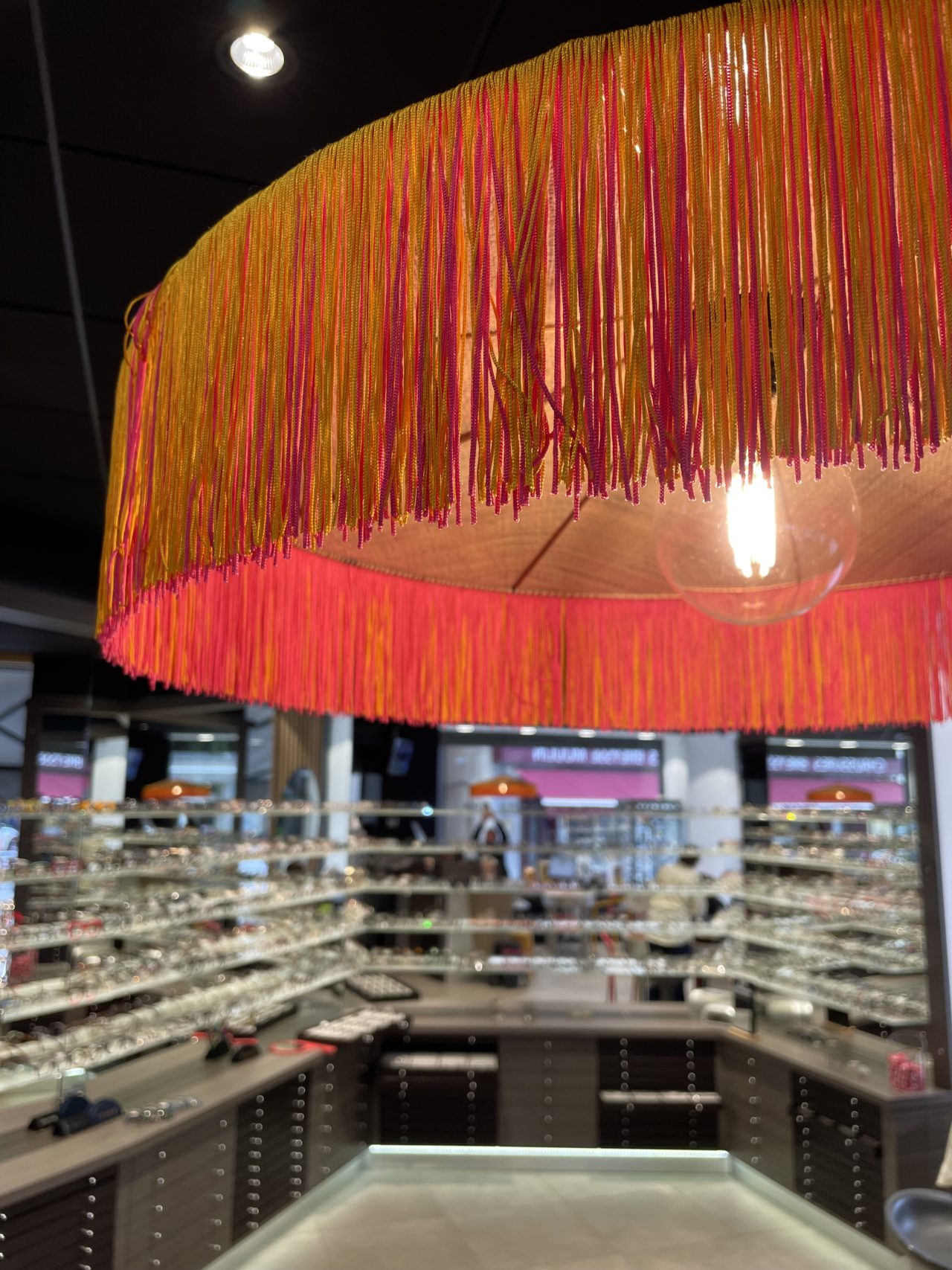 Les luminaires, conçus spécifiquement pour le lieu, reprennent les couleurs de la nouvelle identité de la boutique et participent à son dynamisme visuel. Dans la salle de consultation, une fresque murale réalisée à la main vient renforcer le caractère unique du projet, transformant cet espace technique en un lieu singulier.