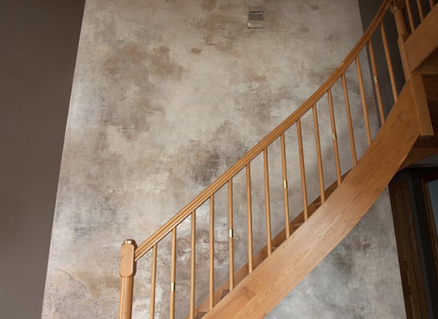 Le mur sur lequel vient s’adosser l’escalier bénéficie d’un traitement particulier. Traité comme une oeuvre d’art, ce mur prend la forme d’un tableau et donne le ton à toute la maison. Cette décoration murale met en scène le coeur de la maison il fait de cette pièce de vie un endroit inimitable…