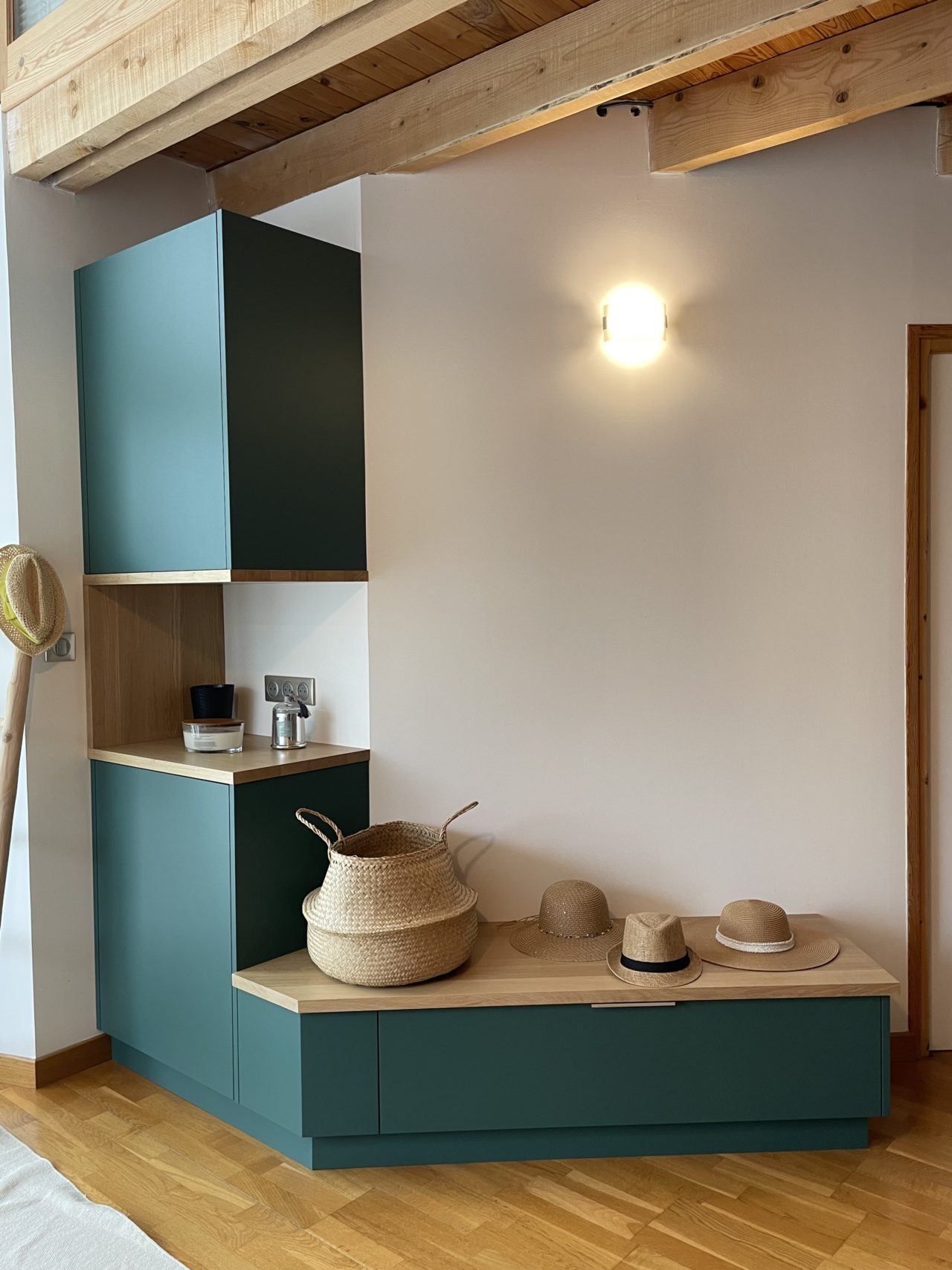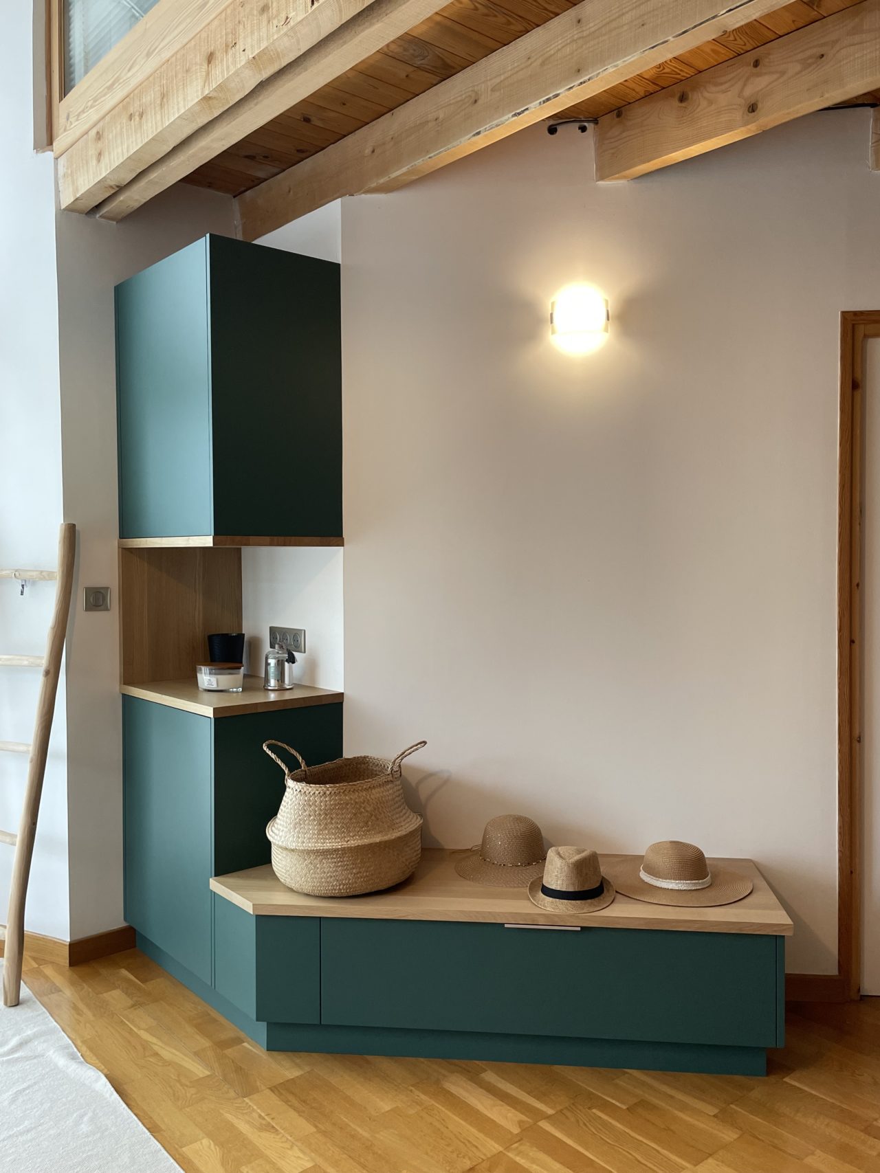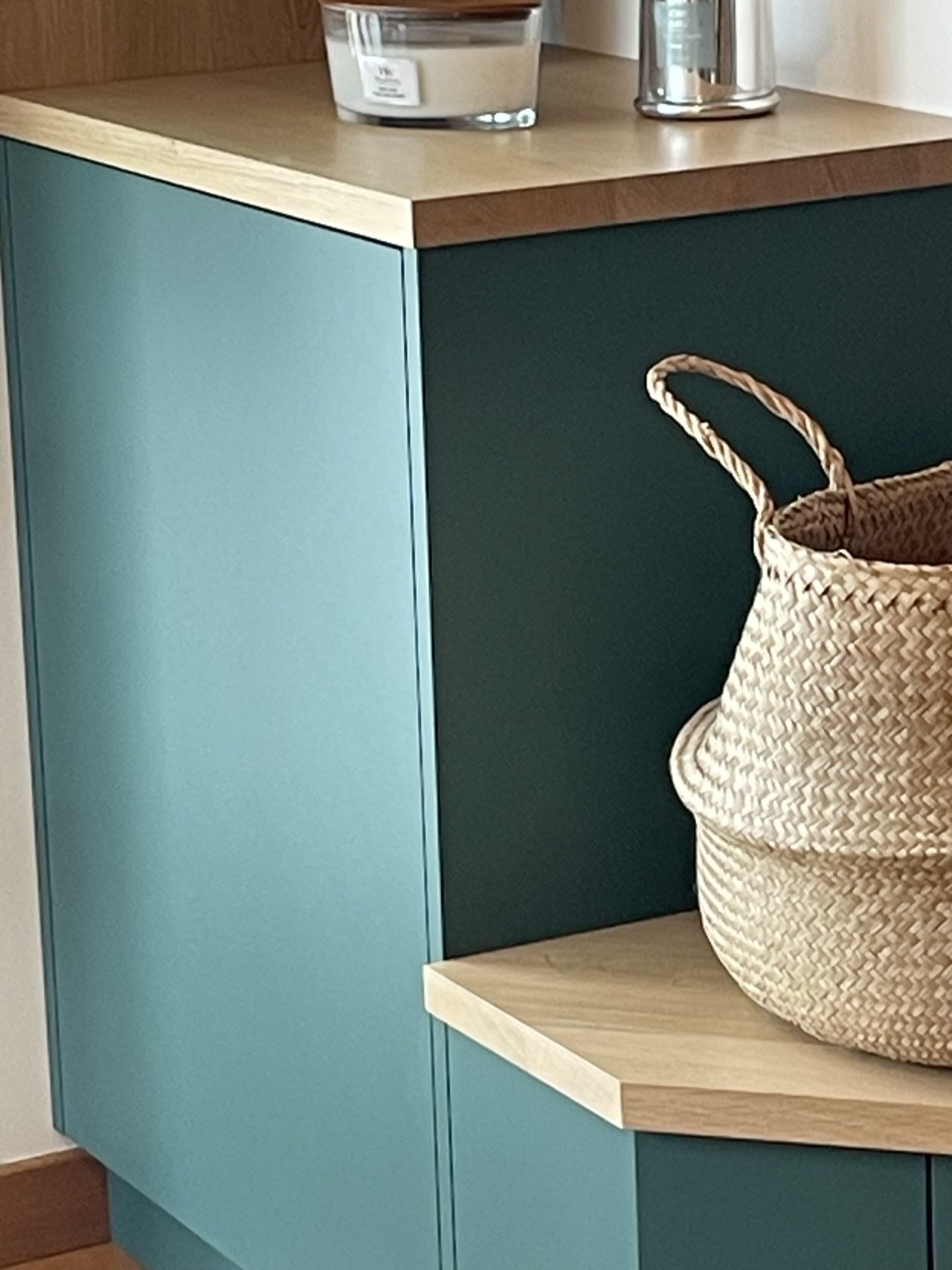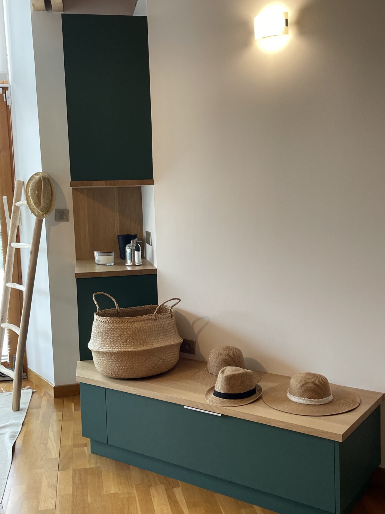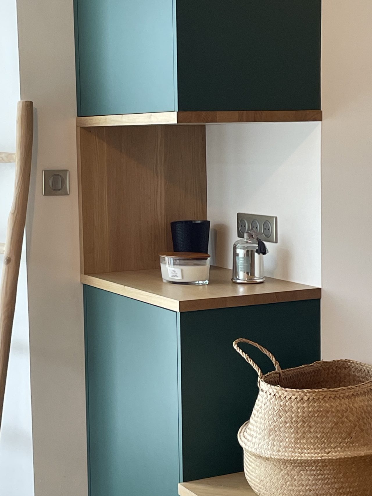 L’équilibre entre fonctionnalité et esthétique a guidé l’ensemble de la conception. Ce meuble structure le recoin, lui donne une véritable présence et transforme un vide en un espace utile. Les matériaux et les finitions ont été choisis afin de dialoguer harmonieusement avec la décoration déjà en place et de s’intégrer naturellement à l’univers de la pièce.