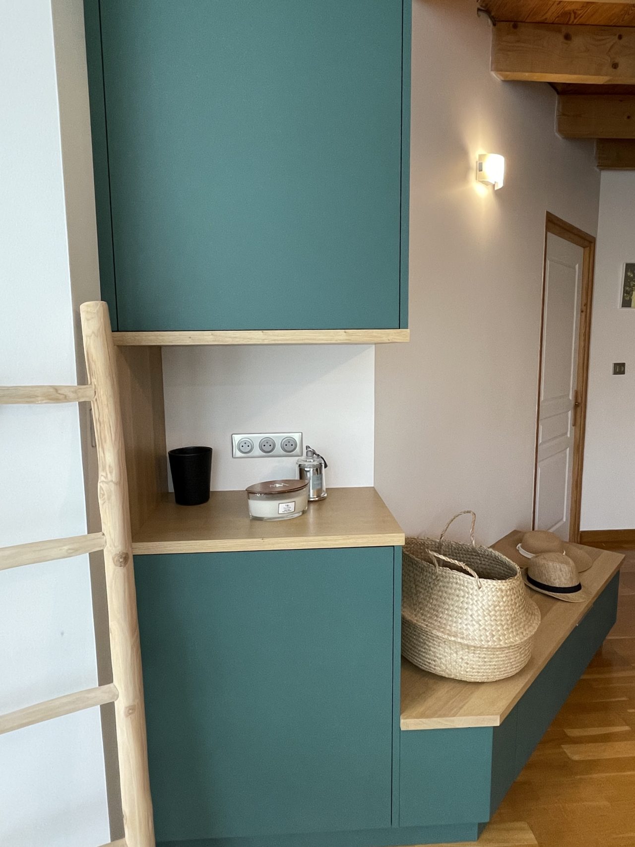 L’équilibre entre fonctionnalité et esthétique a guidé l’ensemble de la conception. Ce meuble structure le recoin, lui donne une véritable présence et transforme un vide en un espace utile. Les matériaux et les finitions ont été choisis afin de dialoguer harmonieusement avec la décoration déjà en place et de s’intégrer naturellement à l’univers de la pièce.