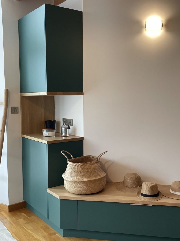 Dans ce projet d’agencement intérieur, j’ai souhaité transformer un recoin jusque-là vide et inexploité en un espace de rangement fonctionnel. Ce type d’espace, souvent perçu comme une contrainte, représente une véritable opportunité de création.
