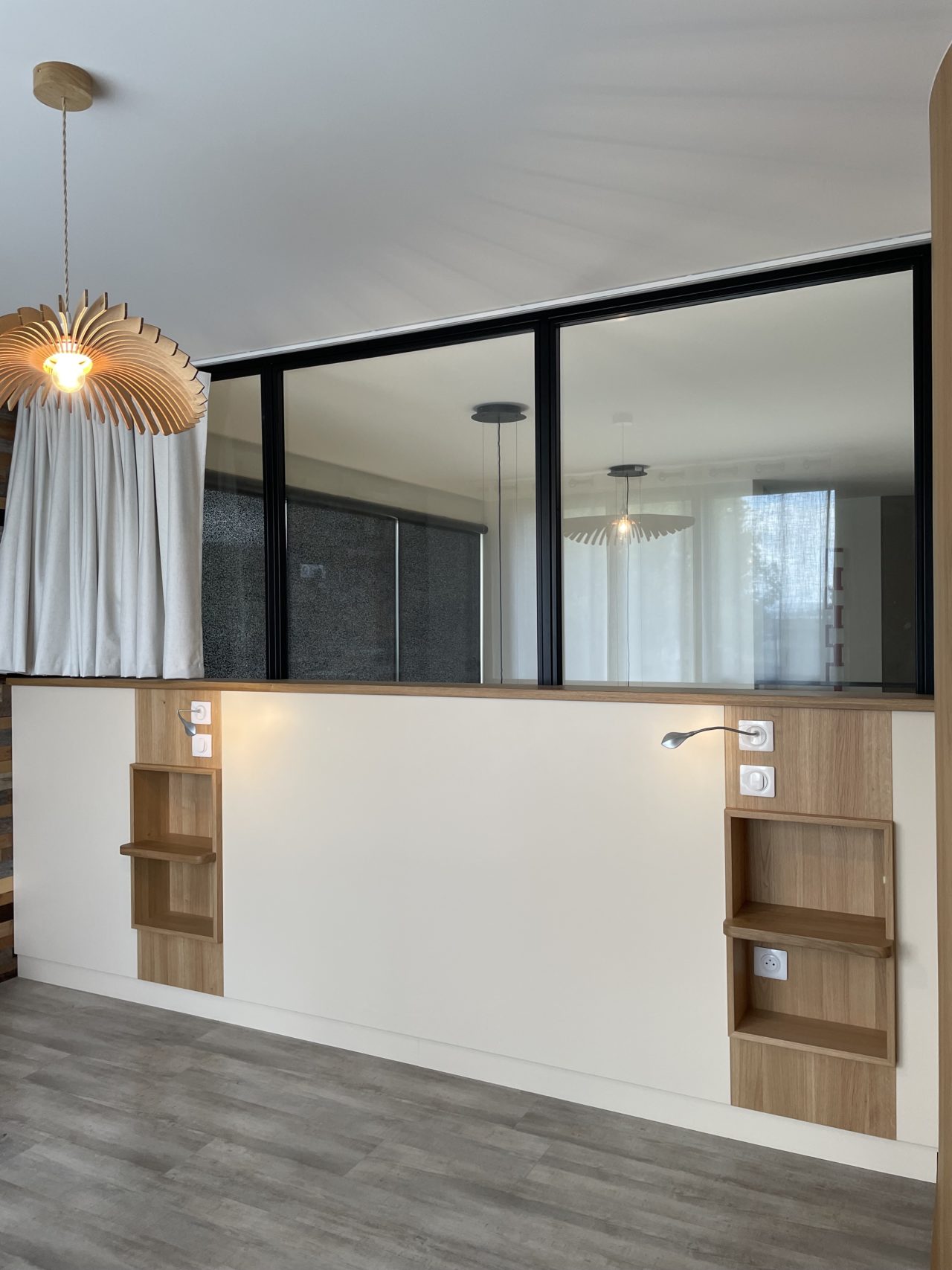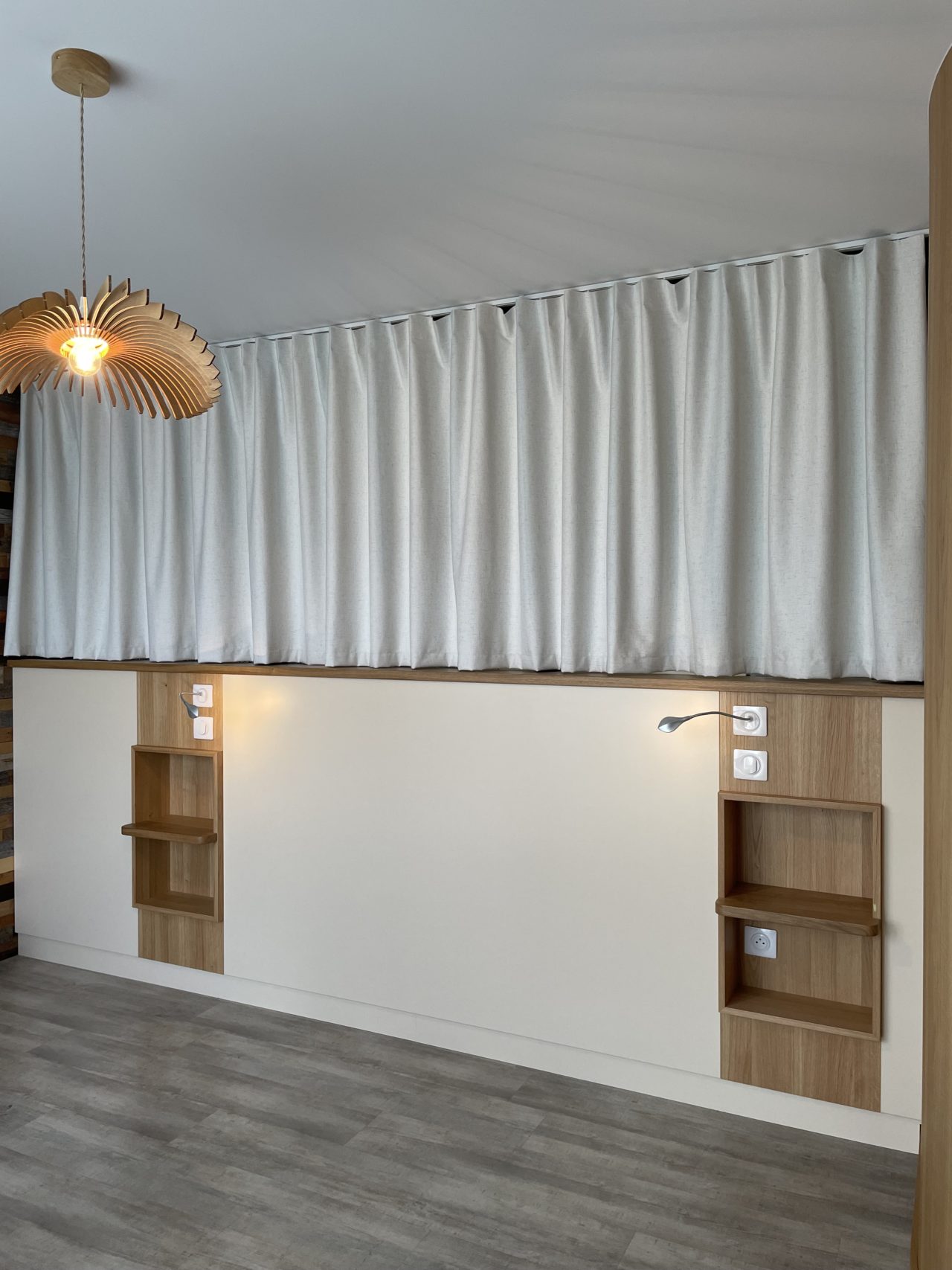 La tête de lit a été imaginée pour s’harmoniser avec la cloison, créant une unité visuelle et renforçant la sobriété chic de l’ensemble. Chaque choix, du bois massif aux finitions, a été pensé pour allier élégance, confort et qualité d’exécution, malgré les nombreuses contraintes techniques rencontrées lors de la réalisation.