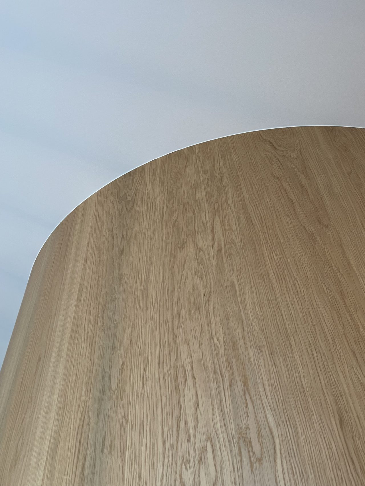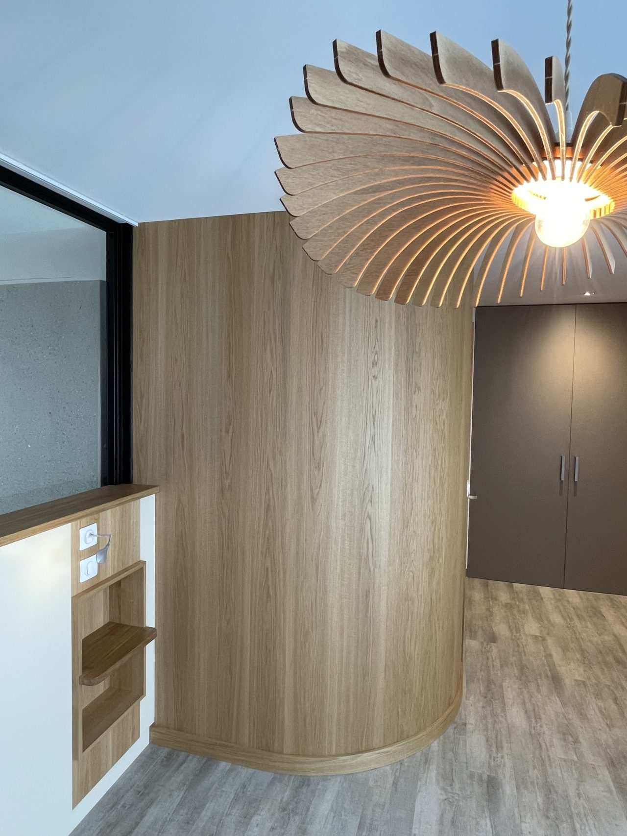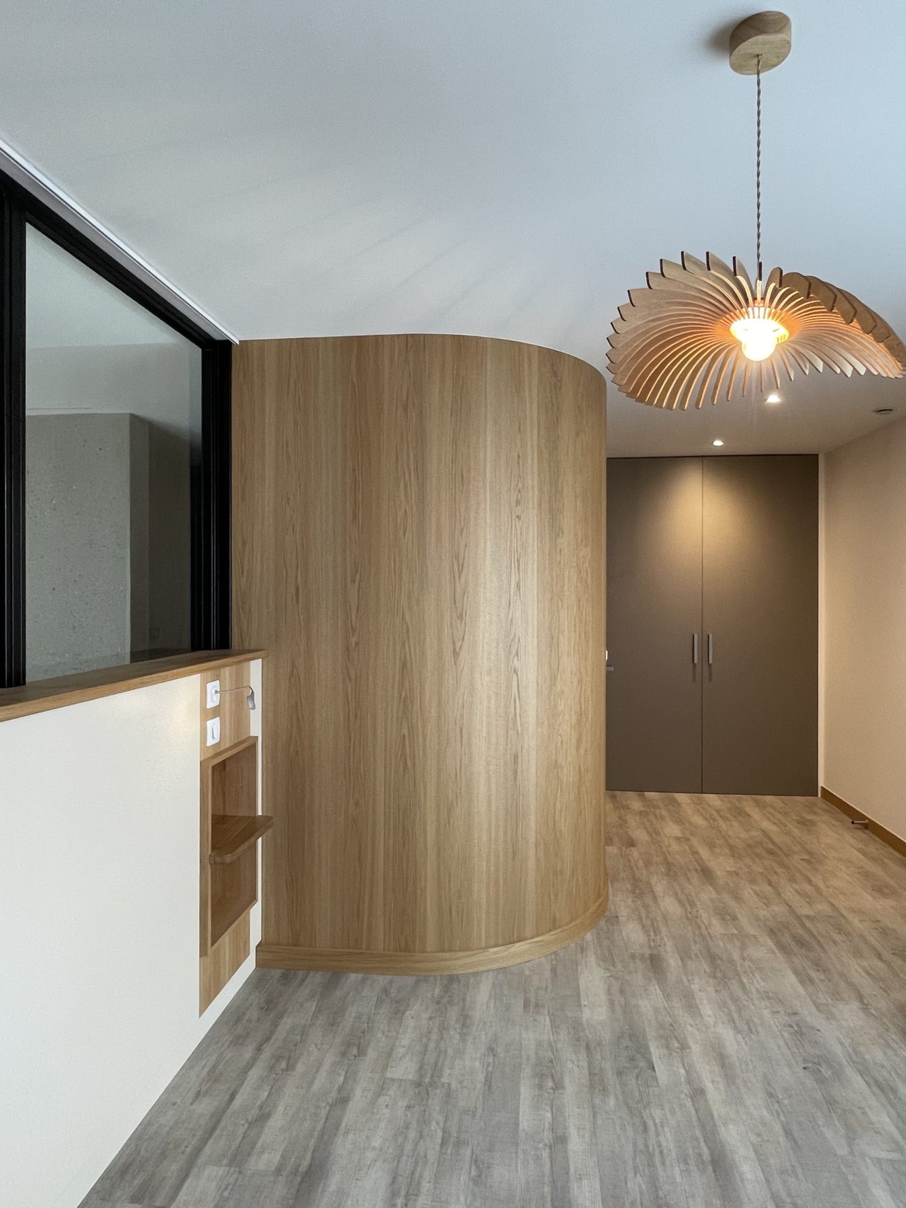 Le parti pris majeur a été la réalisation d’une cloison cintrée en bois massif, conçue sur mesure pour apporter à la pièce un effet doux et atypique. Cette cloison structure l’espace tout en introduisant un détail architectural singulier, véritable signature de la chambre.