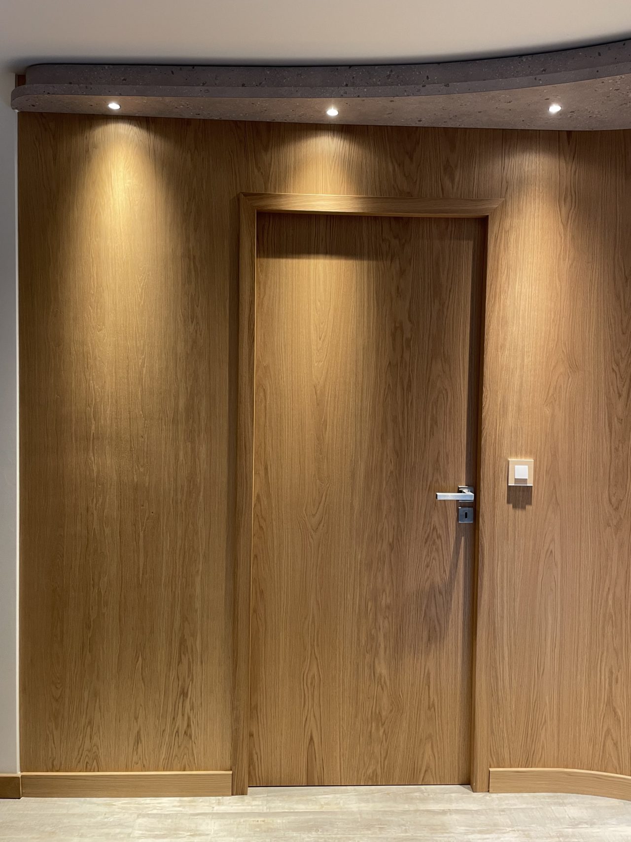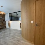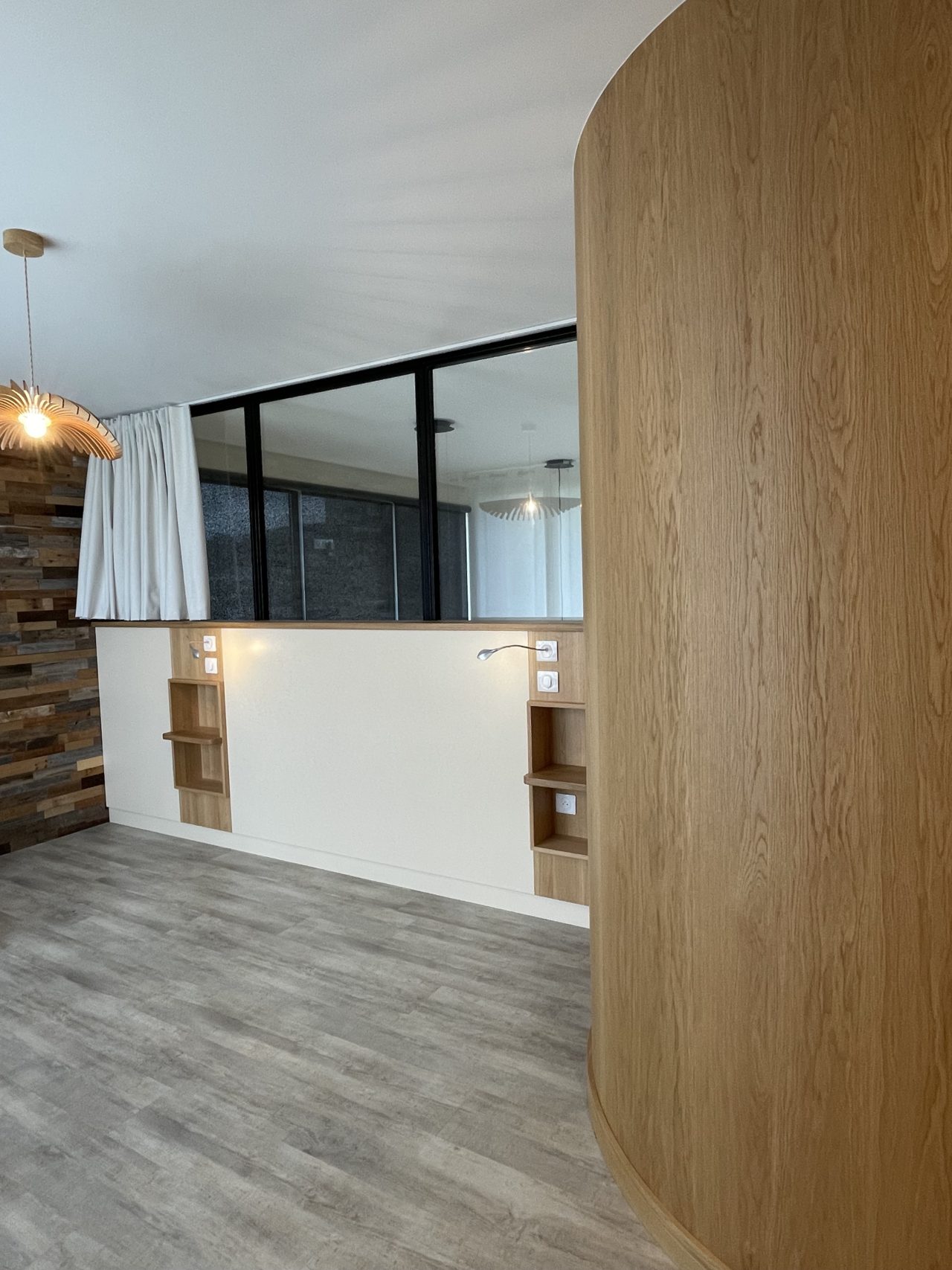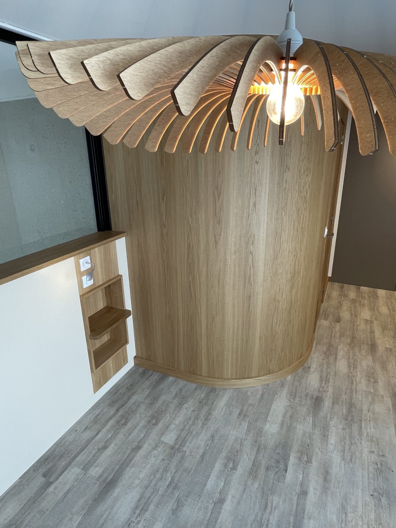 Le parti pris majeur a été la réalisation d’une cloison cintrée en bois massif, conçue sur mesure pour apporter à la pièce un effet doux et atypique. Cette cloison structure l’espace tout en introduisant un détail architectural singulier, véritable signature de la chambre.